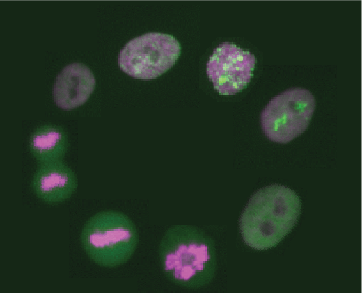 MCF10A cells undergoing cell division. Chromosomes are labeled in magenta (Histone H2B), a component of the replication fork is labeled in green (PCNA).